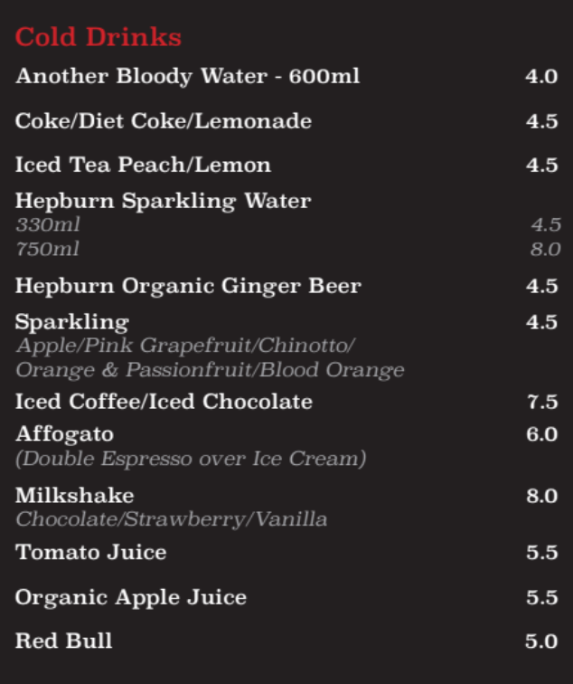 | Pork & Veal Meatballs Meatballs with turkish bread fingers plus rocket, pine nuts & parmesan salad | $23.00 |